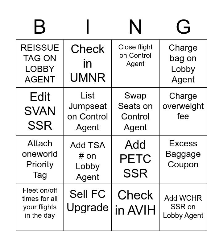 This bingo card has 16 words: Sell FC Upgrade, Excess Baggage Coupon, Close flight on Control Agent, REISSUE TAG ON LOBBY AGENT, Attach oneworld Priority Tag, Check in UMNR, Add PETC SSR, Check in AVIH, Edit SVAN SSR, List Jumpseat on Control Agent, Fleet on/off times for all your flights in the day, Charge bag on Lobby Agent, Add TSA # on Lobby Agent, Charge overweight fee, Swap Seats on Control Agent and Add WCHR SSR on Lobby Agent.