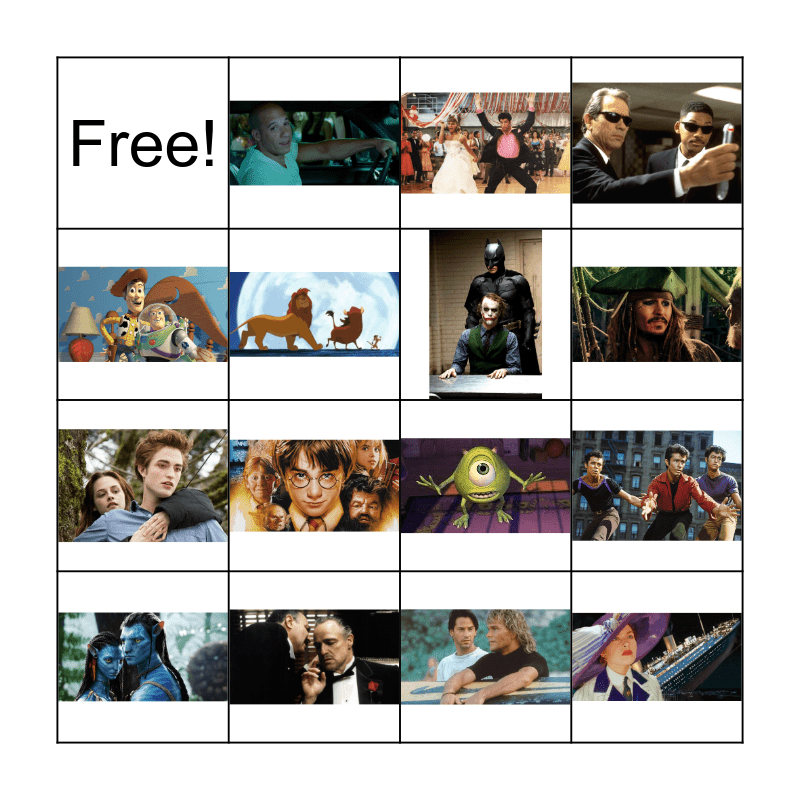 This bingo card has 38 images and 2 words: Free! and Free Space.