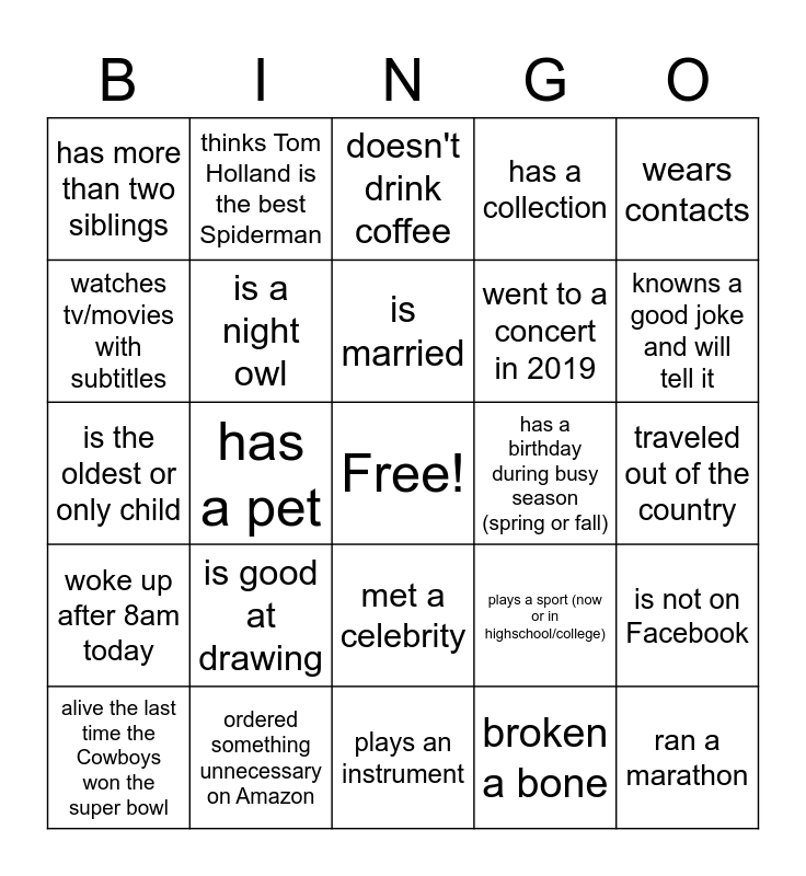 This bingo card has a free space and 30 words: ordered something unnecessary on Amazon, binge-watched an entire series on Netflix, has a pet, speaks another language, has more than two siblings, doesn't drink coffee, is a night owl, met a celebrity, has a birthday during busy season (spring or fall), plays an instrument, traveled out of the country, ran a marathon, broken a bone, kept up with their new years resolution, knowns a good joke and will tell it, has children, plays a sport (now or in highschool/college), woke up after 8am today, is good at drawing, wears contacts, is the oldest or only child, watched all the Twilight movies, thinks Tom Holland is the best Spiderman, went to a concert in 2019, watches tv/movies with subtitles, has a collection, is not on Facebook, alive the last time the Cowboys won the super bowl, is married and wearing red.