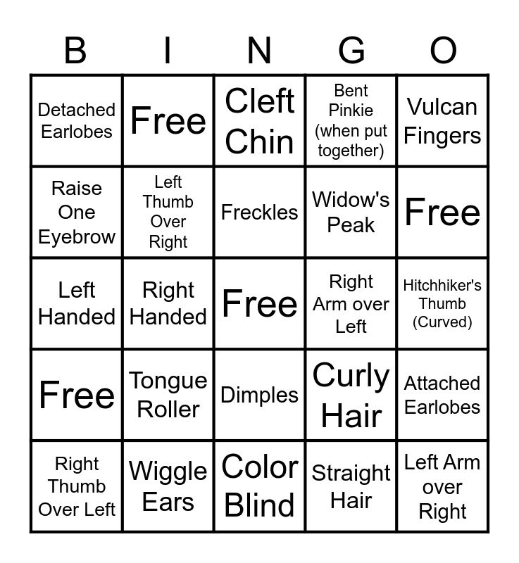 This bingo card has a free space and 24 words: Right Thumb Over Left, Tongue Roller, Freckles, Straight Hair, Vulcan Fingers, Detached Earlobes, Free, Cleft Chin, Right Arm over Left, Hitchhiker's Thumb (Curved), Left Handed, Left Thumb Over Right, Curly Hair, Attached Earlobes, Raise One Eyebrow, Wiggle Ears, Color Blind, Bent Pinkie (when put together), Free, Free, Right Handed, Dimples, Widow's Peak and Left Arm over Right.