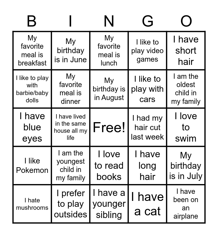 This bingo card has a free space and 29 words: I hate mushrooms, My favorite vegetable is corn, I have lived in the same house all my life, I have a dog, My favorite meal is breakfast, My favorite meal is lunch, My favorite meal is dinner, I am the youngest child in my family, I had my hair cut last week, I prefer to play outsides, I love to swim, I have been on an airplane, I have a younger sibling, I have a cat, I am the oldest child in my family, I have blue pajamas, I love to read books, I like Pokemon, I have short hair, I have blue eyes, I have long hair, I have brown eyes, I like to play with cars, I like to play with barbie/baby dolls, I like to play video games, My birthday is in June, My birthday is in July, My birthday is in August and This is my first year at camp.