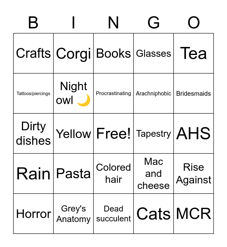 This bingo card has a free space and 24 words: Pasta, Grey's Anatomy, Procrastinating, Horror, Tea, Crafts, Tattoos/piercings, Corgi, Tapestry, Colored hair, Arachniphobic, Dirty dishes, Mac and cheese, Rise Against, Night owl 🌙, Cats, AHS, Books, Bridesmaids, Yellow, MCR, Rain, Glasses and Dead succulent.