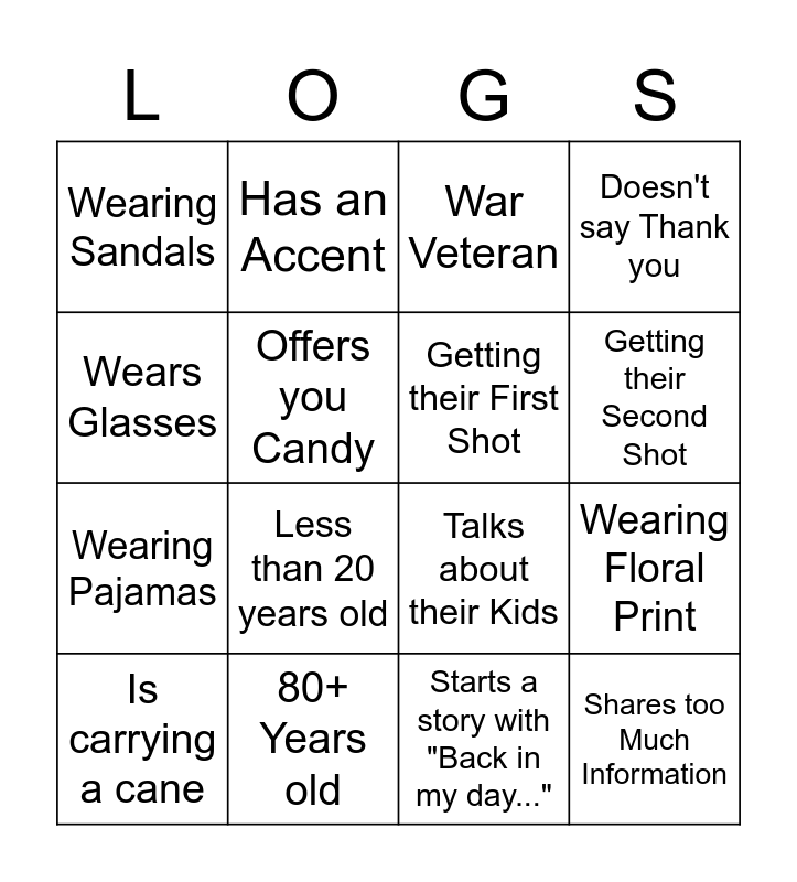 This bingo card has 16 words: 80+ Years old, Wearing Floral Print, War Veteran, Wearing Sandals, Wearing Pajamas, Has an Accent, Talks about their Kids, Starts a story with "Back in my day...", Wears Glasses, Offers you Candy, Is carrying a cane, Doesn't say Thank you, Less than 20 years old, Getting their Second Shot, Getting their First Shot and Shares too Much Information.
