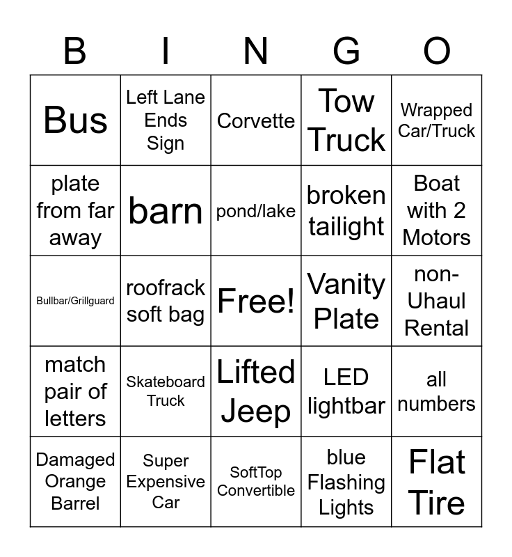 This bingo card has a free space and 43 words: Green Truck, Flat Tire, Wrecked Car, Damaged Orange Barrel, Trailer W/ Three Axles, blue Flashing Lights, Corvette, Yellow Car, Wrapped Car/Truck, Super Expensive Car, Tow Truck, Vanity Plate, Lifted Jeep, Skateboard Truck, RV Towing a Jeep, SoftTop Convertible, Ladder, Bullbar/Grillguard, Lowered Car/Truck, Boat with 2 Motors, Left Lane Ends Sign, Punny Billboard, Oversized Load, Bus, Lane Closed Sign, non-Uhaul Rental, Excavator, Empty Trailer, LED lightbar, match pair of letters, all letters, all numbers, diesel pickup, roofrack soft bag, dog, stick family decals, a church, pond/lake, plate from far away, broken tailight, plane, barn and motorcycle.