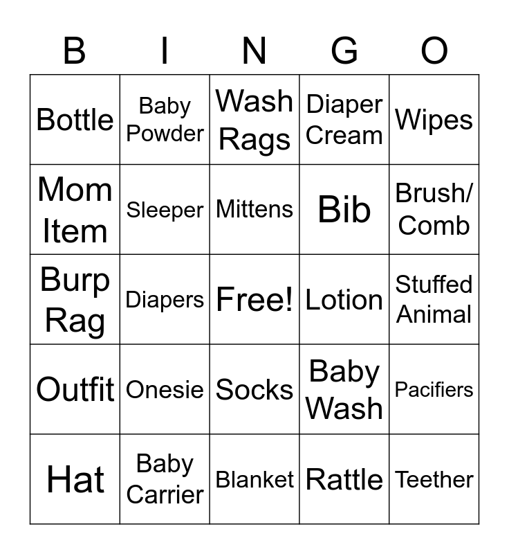 This bingo card has a free space and 24 words: Onesie, Baby Carrier, Mittens, Hat, Wipes, Bottle, Mom Item, Baby Powder, Lotion, Socks, Bib, Burp Rag, Baby Wash, Pacifiers, Sleeper, Rattle, Stuffed Animal, Wash Rags, Brush/ Comb, Diapers, Teether, Outfit, Diaper Cream and Blanket.