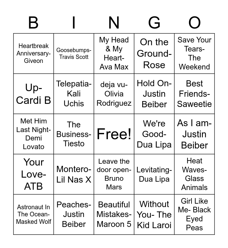This bingo card has a free space and 24 words: Montero- Lil Nas X, Peaches- Justin Beiber, deja vu- Olivia Rodriguez, Astronaut In The Ocean- Masked Wolf, Save Your Tears- The Weekend, Heartbreak Anniversary- Giveon, Up- Cardi B, Goosebumps- Travis Scott, We're Good- Dua Lipa, Leave the door open- Bruno Mars, Hold On- Justin Beiber, Met Him Last Night- Demi Lovato, Levitating- Dua Lipa, Heat Waves- Glass Animals, Telepatia- Kali Uchis, Without You- The Kid Laroi, As I am- Justin Beiber, My Head & My Heart- Ava Max, Best Friends- Saweetie, The Business- Tiesto, Girl Like Me- Black Eyed Peas, Your Love- ATB, On the Ground- Rose and Beautiful Mistakes- Maroon 5.