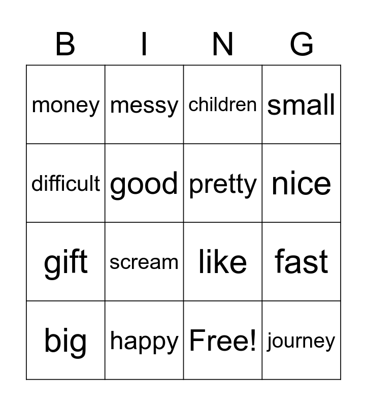 This bingo card has 17 words: Free!, big, children, money, scream, small, fast, pretty, nice, good, happy, like, difficult, messy, gift, delicious and journey.