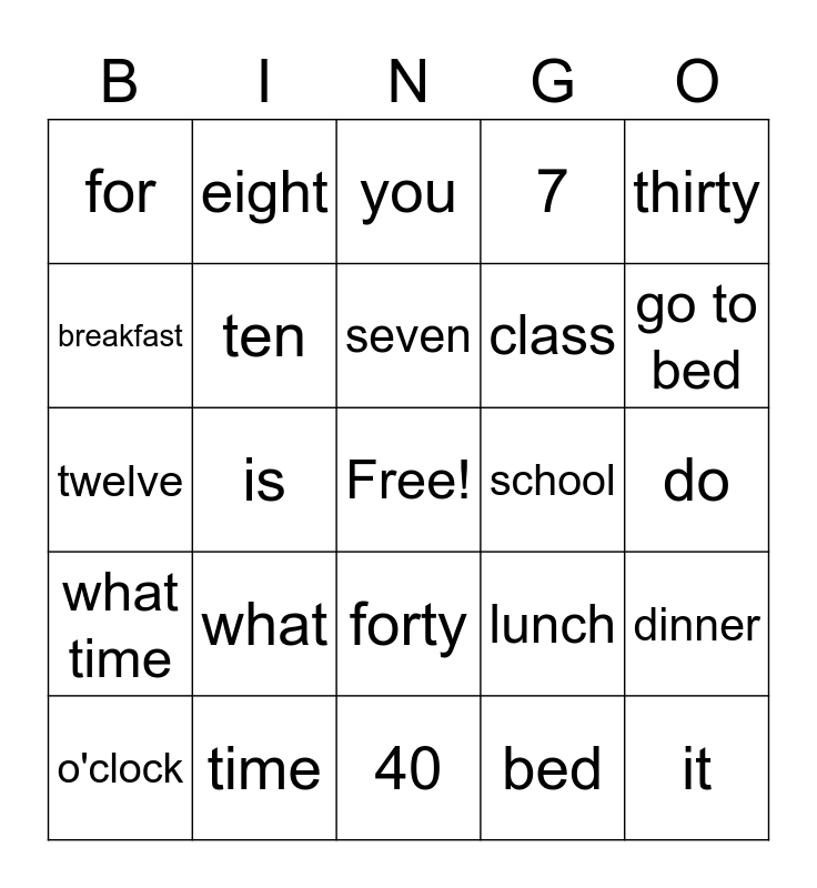This bingo card has a free space and 24 words: what, time, seven, o'clock, thirty, for, breakfast, eight, school, forty, class, twelve, lunch, dinner, ten, bed, do, you, go to bed, is, it, what time, 7 and 40.