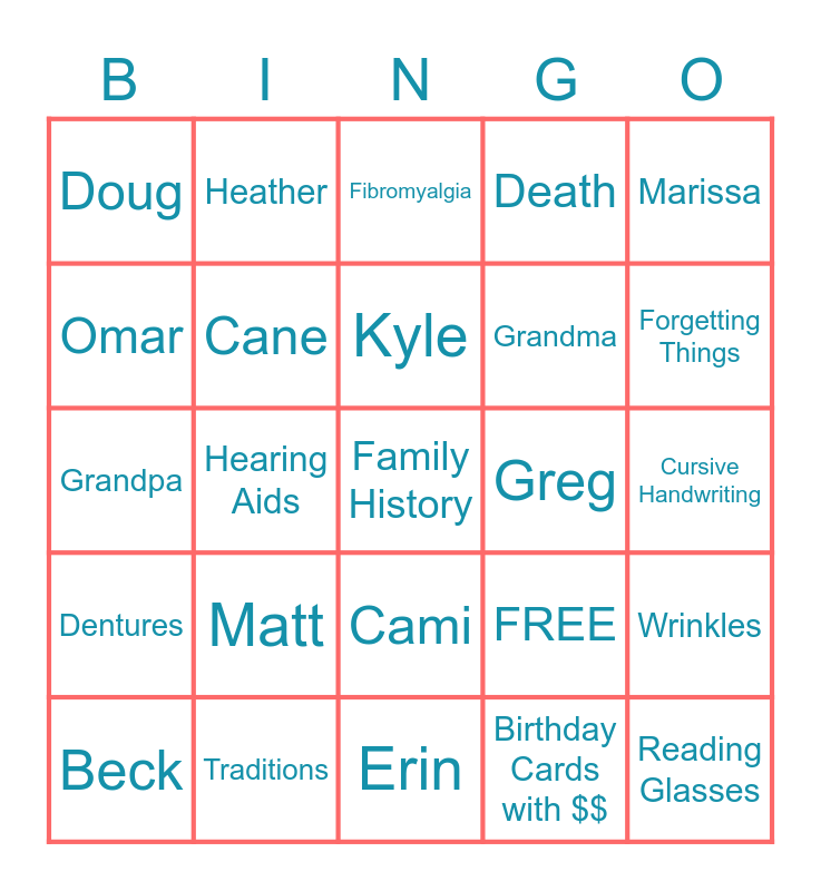 This bingo card has 25 words: Matt, Erin, Kyle, Beck, Marissa, Doug, Omar, Heather, Greg, Cami, Grandma, Grandpa, FREE, Wrinkles, Cane, Reading Glasses, Cursive Handwriting, Fibromyalgia, Forgetting Things, Hearing Aids, Family History, Traditions, Dentures, Death and Birthday Cards with $$.