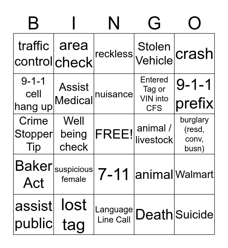 This bingo card has a free space and 24 words: suspicious female, lost tag, nuisance, assist public, crash, traffic control, 9-1-1 cell hang up, area check, animal / livestock, 7-11, Entered Tag or VIN into CFS, Crime Stopper Tip, animal, Walmart, Assist Medical, Death, burglary (resd, conv, busn), reckless, 9-1-1 prefix, Well being check, Suicide, Baker Act, Stolen Vehicle and Language Line Call.