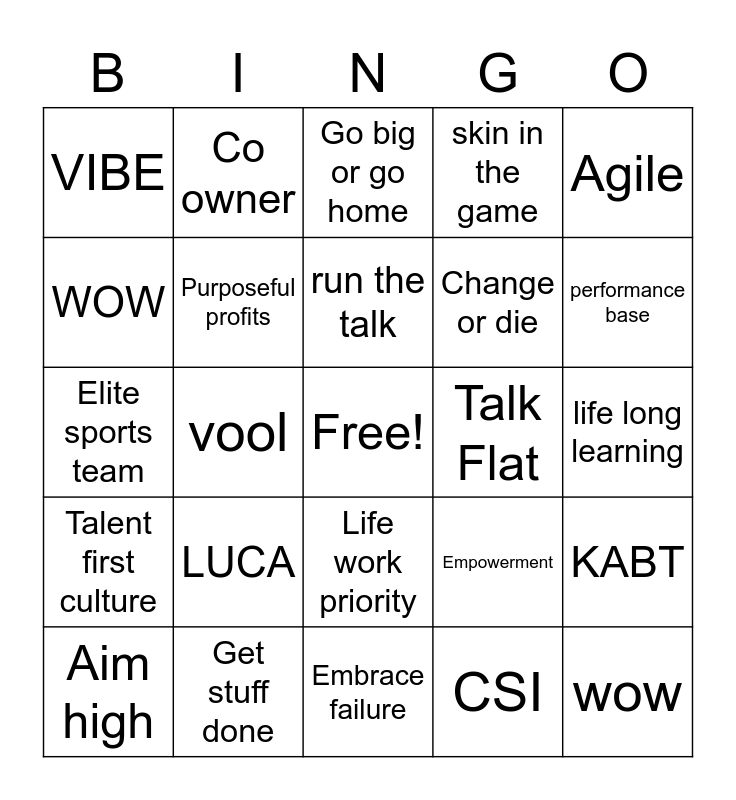 This bingo card has a free space and 24 words: LUCA, Get stuff done, run the talk, Aim high, Agile, VIBE, WOW, Co owner, Talk Flat, Life work priority, Change or die, Elite sports team, Empowerment, KABT, Purposeful profits, CSI, life long learning, Go big or go home, performance base, vool, wow, Talent first culture, skin in the game and Embrace failure.