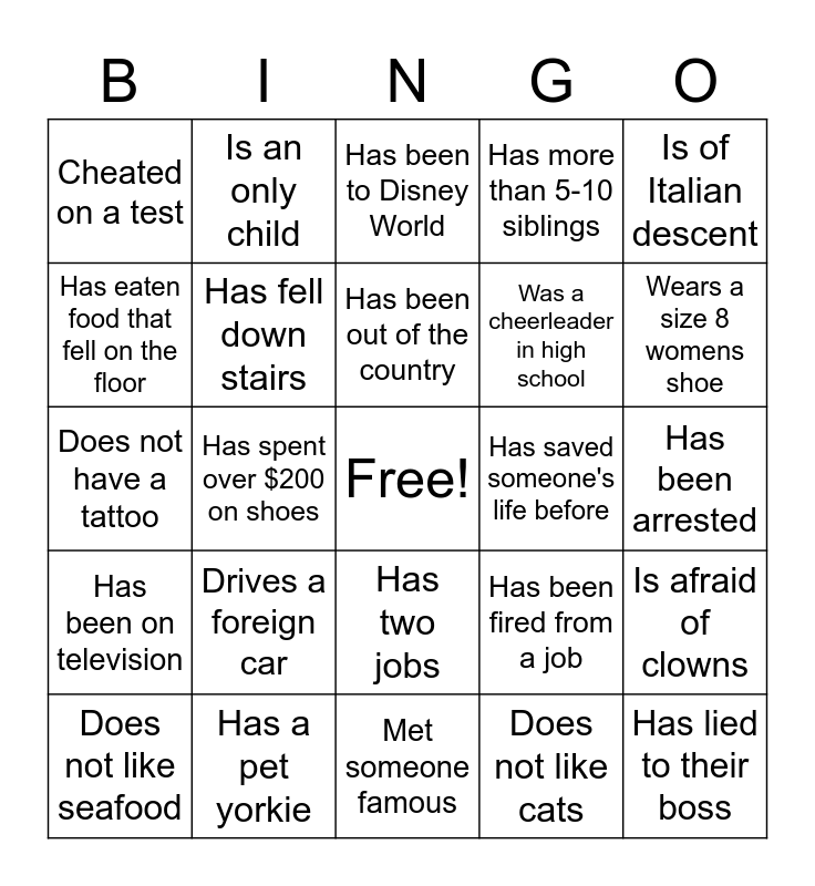 This bingo card has a free space and 24 words: Drives a foreign car, Has a pet yorkie, Has been out of the country, Does not like seafood, Is of Italian descent, Cheated on a test, Has eaten food that fell on the floor, Is an only child, Has saved someone's life before, Has two jobs, Was a cheerleader in high school, Does not have a tattoo, Has been fired from a job, Is afraid of clowns, Has fell down stairs, Does not like cats, Has been arrested, Has been to Disney World, Wears a size 8 womens shoe, Has spent over $200 on shoes, Has lied to their boss, Has been on television, Has more than 5-10 siblings and Met someone famous.