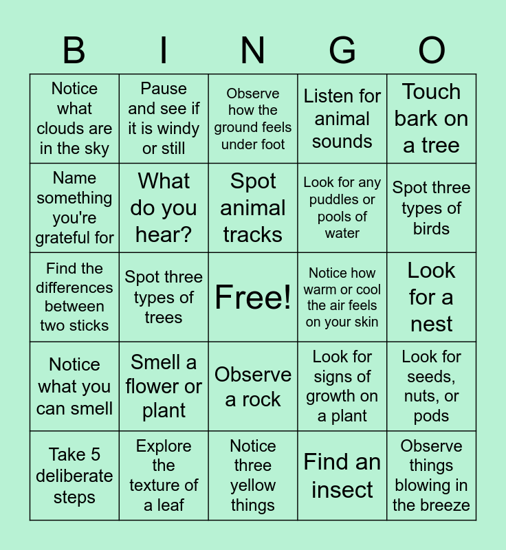 This bingo card has a free space and 24 words: Smell a flower or plant, Explore the texture of a leaf, Spot animal tracks, Take 5 deliberate steps, Touch bark on a tree, Notice what clouds are in the sky, Name something you're grateful for, Pause and see if it is windy or still, Notice how warm or cool the air feels on your skin, Observe a rock, Look for any puddles or pools of water, Find the differences between two sticks, Look for signs of growth on a plant, Look for seeds, nuts, or pods, What do you hear?, Find an insect, Look for a nest, Observe how the ground feels under foot, Spot three types of birds, Spot three types of trees, Observe things blowing in the breeze, Notice what you can smell, Listen for animal sounds and Notice three yellow things.