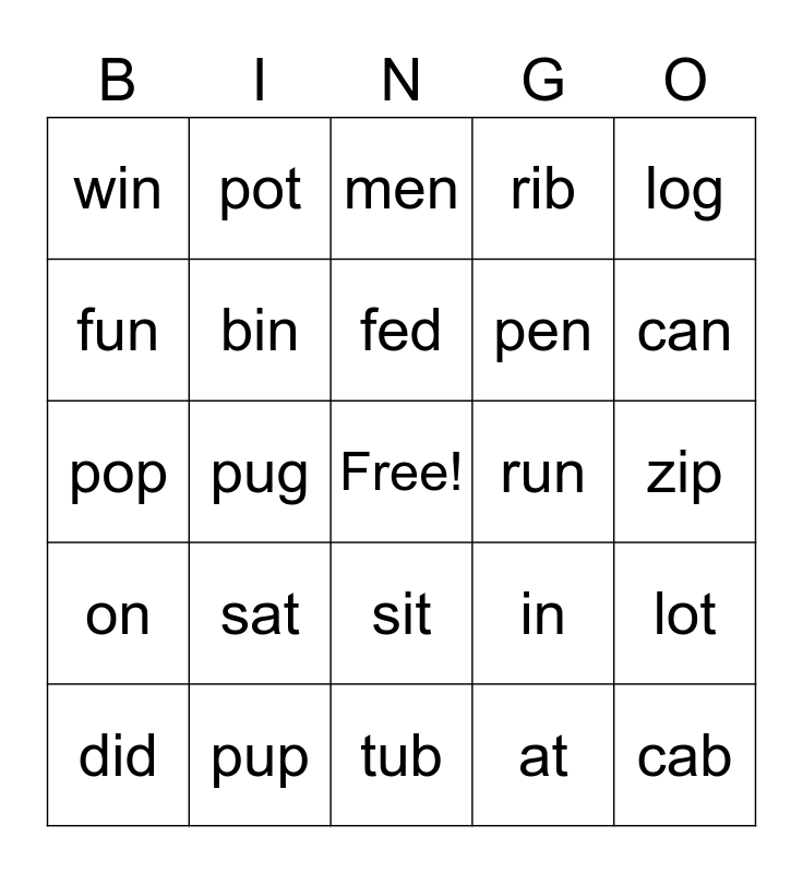 This bingo card has a free space and 24 words: sat, pup, fed, did, log, win, fun, pot, run, sit, pen, pop, in, lot, bin, at, zip, men, can, pug, cab, on, rib and tub.