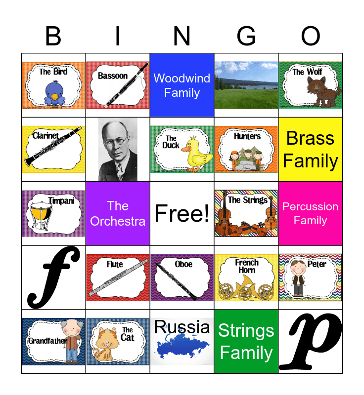 This bingo card has 19 images, a free space and 6 words: Strings Family, Percussion Family, Woodwind Family, Brass Family, The Orchestra and Russia.