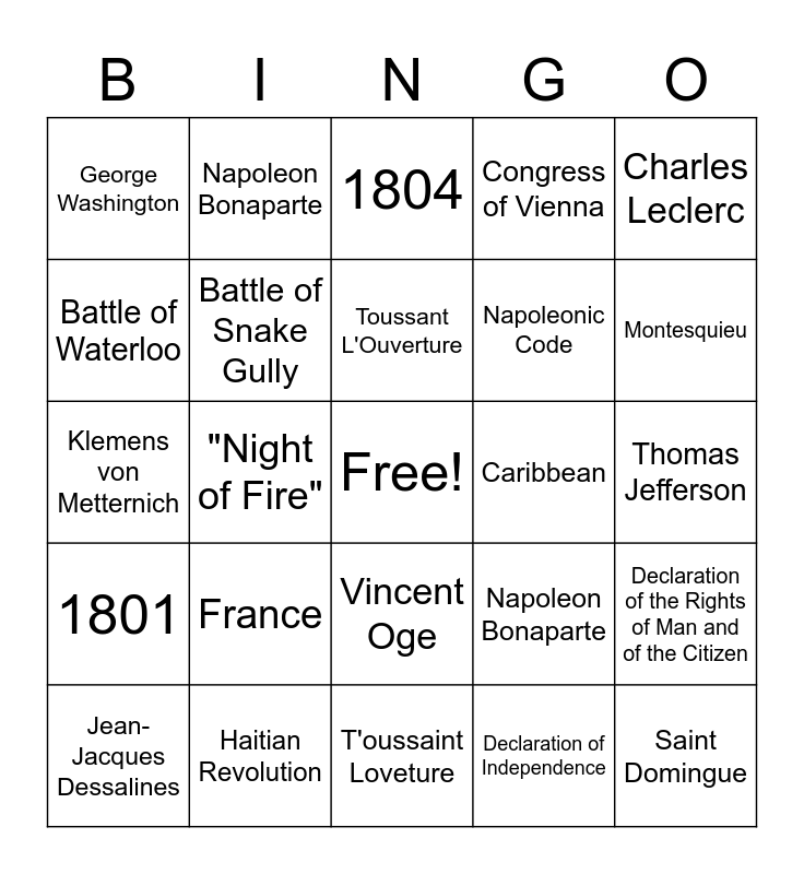 This bingo card has a free space and 31 words: T'oussaint Loveture, Haitian revolution, "Night of Fire", Yellow Fever, George Washington, 1804, Battle of Snake Gully, Napoleon Bonaparte, Caribbean, Declaration of Independence, Thomas Jefferson, Saint Domingue, 1791, Dominican Republic, Montesquieu, Black Republic, Declaration of the Rights of Man and of the Citizen, France, 1801, Vincent Oge, Charles Leclerc, Soccer, Jean-Jacques Dessalines, Napoleon Bonaparte, Napoleonic Code, Battle of Waterloo, Congress of Vienna, Klemens von Metternich, Haitian Revolution, Toussant L'Ouverture and Mexican War of Independence.