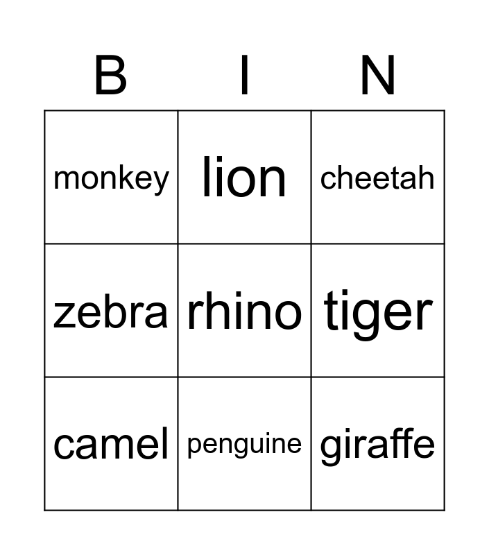This bingo card has 9 words: camel, cheetah, lion, zebra, monkey, tiger, rhino, giraffe and penguine.