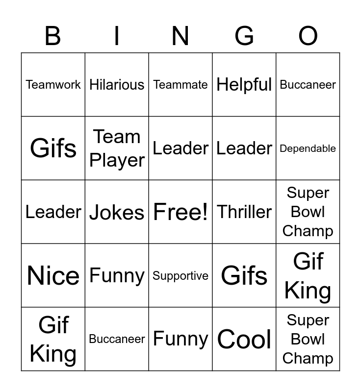This bingo card has a free space and 63 words: Collaborative, Moen, Dependable, Gif King, Music Producer, Cool, Hilarious, Team Player, Leader, Thriller, Supportive, Video editor, Super Bowl Champ, Buccaneer, Speed Dating, Gifs, Jokes, Teamwork, Competitive, Leader, Funny, Nice, Helpful, “Jeffrey”, Teammate, Bruce Wayne, Clark Kent, Peter Parker, Steven Rogers, Logan Howlett, DJ, Marvel Fan, Collaborative, Moen, Dependable, Gif King, Music Producer, Cool, Hilarious, Team Player, Leader, Thriller, Supportive, Video editor, Super Bowl Champ, Buccaneer, Speed Dating, Gifs, Jokes, Teamwork, Competitive, Funny, Nice, Helpful, “Jeffrey”, Teammate, Bruce Wayne, Clark Kent, Peter Parker, Steven Rogers, Logan Howlett, DJ and Marvel Fan.