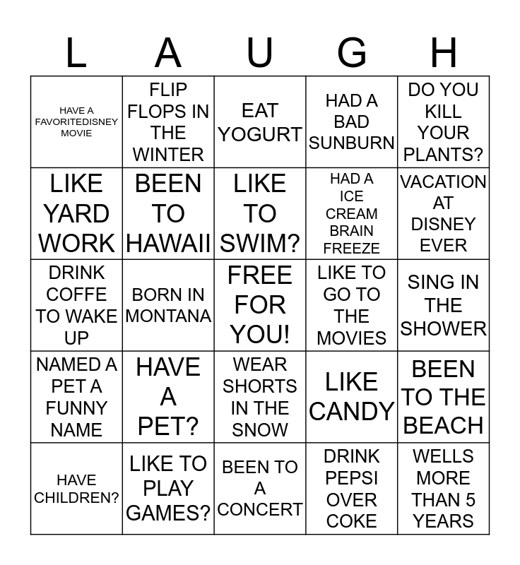 This bingo card has a free space and 24 words: HAVE A PET?, LIKE TO PLAY GAMES?, LIKE TO SWIM?, HAVE CHILDREN?, DO YOU KILL YOUR PLANTS?, HAVE A FAVORITEDISNEY MOVIE, LIKE YARD WORK, FLIP FLOPS IN THE WINTER, LIKE TO GO TO THE MOVIES, WEAR SHORTS IN THE SNOW, HAD A ICE CREAM BRAIN FREEZE, DRINK COFFE TO WAKE UP, LIKE CANDY, BEEN TO THE BEACH, BEEN TO HAWAII, DRINK PEPSI OVER COKE, SING IN THE SHOWER, EAT YOGURT, VACATION AT DISNEY EVER, BORN IN MONTANA, WELLS MORE THAN 5 YEARS, NAMED A PET A FUNNY NAME, HAD A BAD SUNBURN and BEEN TO A CONCERT.