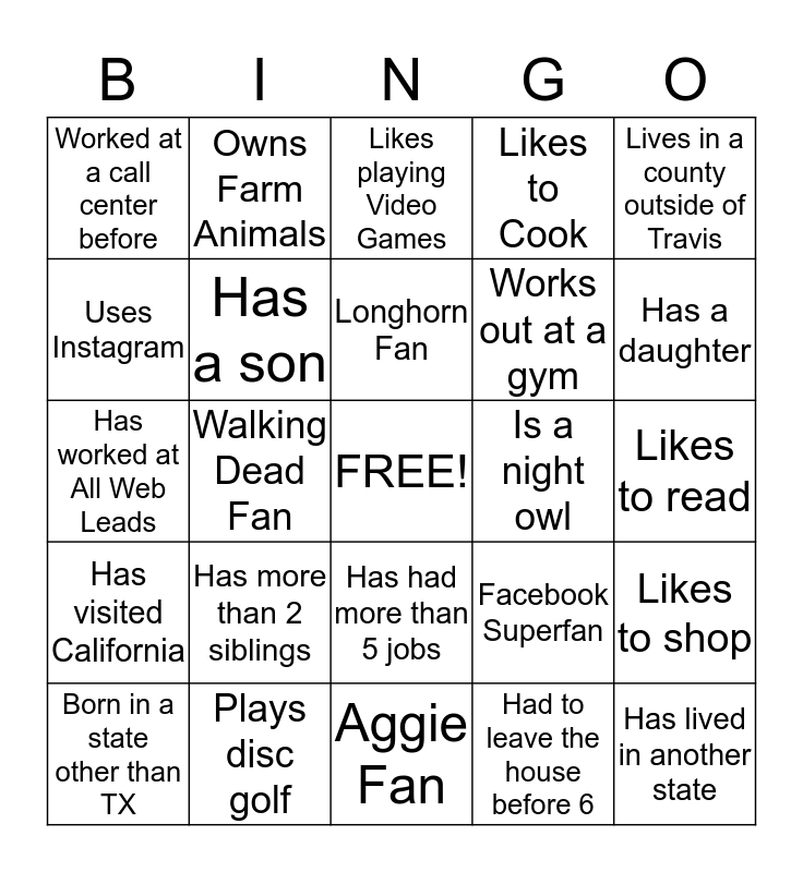 This bingo card has a free space and 24 words: Has more than 2 siblings, Plays disc golf, Longhorn Fan, Born in a state other than TX, Lives in a county outside of Travis, Worked at a call center before, Uses Instagram, Owns Farm Animals, Is a night owl, Has had more than 5 jobs, Works out at a gym, Has worked at All Web Leads, Facebook Superfan, Likes to shop, Has a son, Had to leave the house before 6, Likes to read, Likes playing Video Games, Has a daughter, Walking Dead Fan, Has lived in another state, Has visited California, Likes to Cook and Aggie Fan.