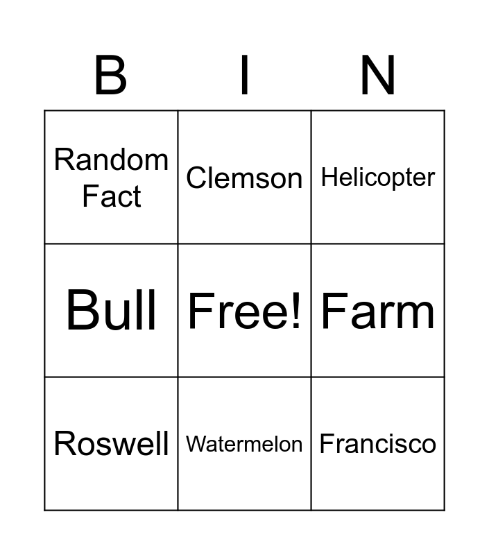 This bingo card has a free space and 8 words: Farm, Helicopter, Clemson, Roswell, Random Fact, Francisco, Bull and Watermelon.