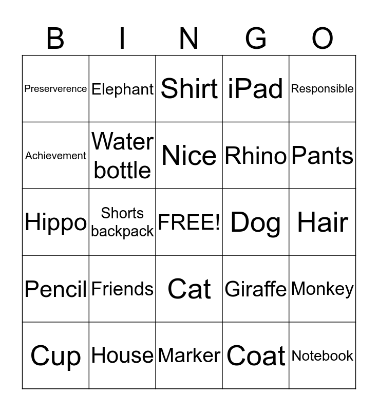 This bingo card has a free space and 24 words: Friends, House, Nice, Cup, Responsible, Preserverence, Achievement, Elephant, Dog, Cat, Rhino, Hippo, Giraffe, Monkey, Water bottle, Coat, Hair, Shirt, Pants, Shorts backpack, Notebook, Pencil, iPad and Marker.