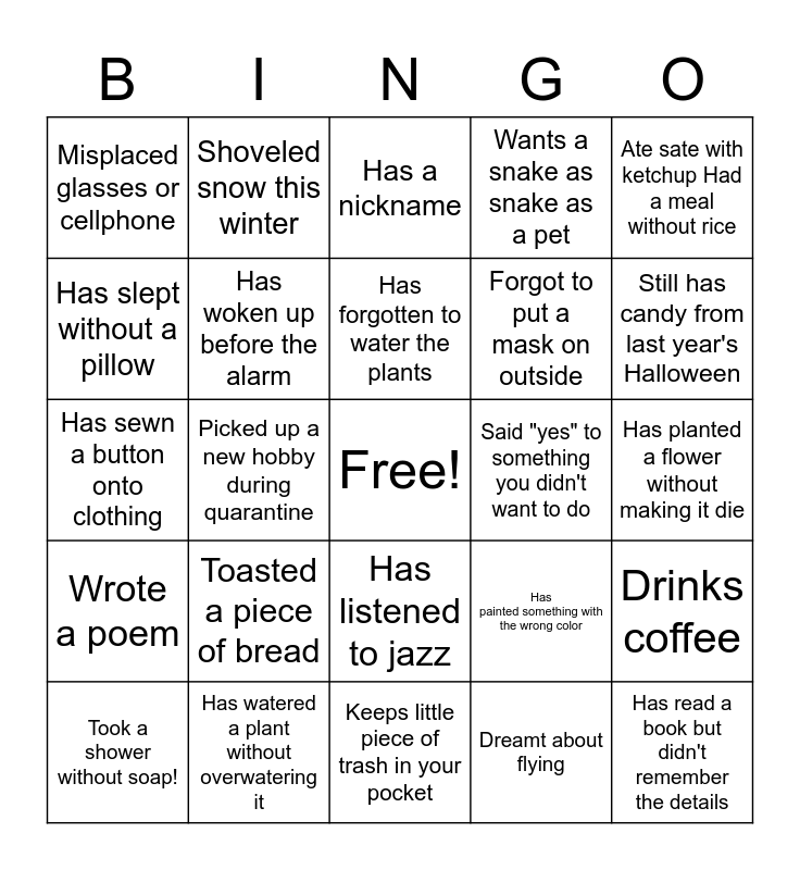 This bingo card has a free space and 24 words: Toasted a piece of bread, Has watered a plant without overwatering it, Has forgotten to water the plants, Took a shower without soap!, Ate sate with ketchup Had a meal without rice, Misplaced glasses or cellphone, Has slept without a pillow, Shoveled snow this winter, Said "yes" to something you didn't want to do, Has listened to jazz, Forgot to put a mask on outside, Has sewn a button onto clothing, Has painted something with the wrong color, Drinks coffee, Has woken up before the alarm, Dreamt about flying, Has planted a flower without making it die, Has a nickname, Still has candy from last year's Halloween, Picked up a new hobby during quarantine, Has read a book but didn't remember the details, Wrote a poem, Wants a snake as snake as a pet and Keeps little piece of trash in your pocket.
