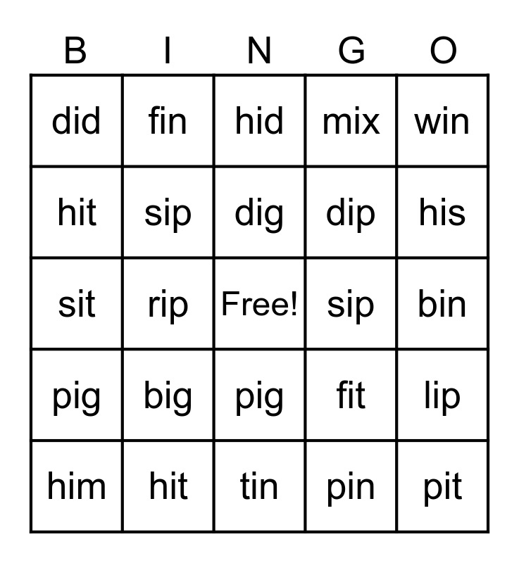 This bingo card has a free space and 24 words: big, hit, dig, him, win, did, hit, fin, sip, pig, dip, sit, fit, lip, sip, pin, bin, hid, his, rip, pit, pig, mix and tin.