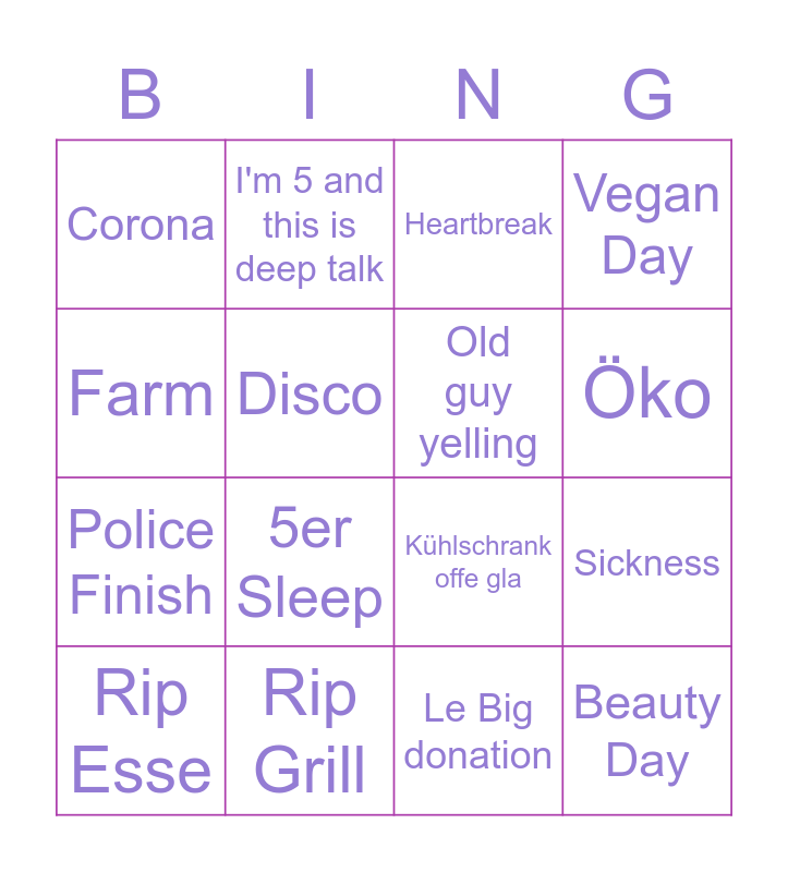 This bingo card has 16 words: Rip Grill, Sickness, Heartbreak, Corona, Police Finish, I'm 5 and this is deep talk, Kühlschrank offe gla, Le Big donation, Farm, Disco, Rip Esse, Vegan Day, 5er Sleep, Öko, Old guy yelling and Beauty Day.