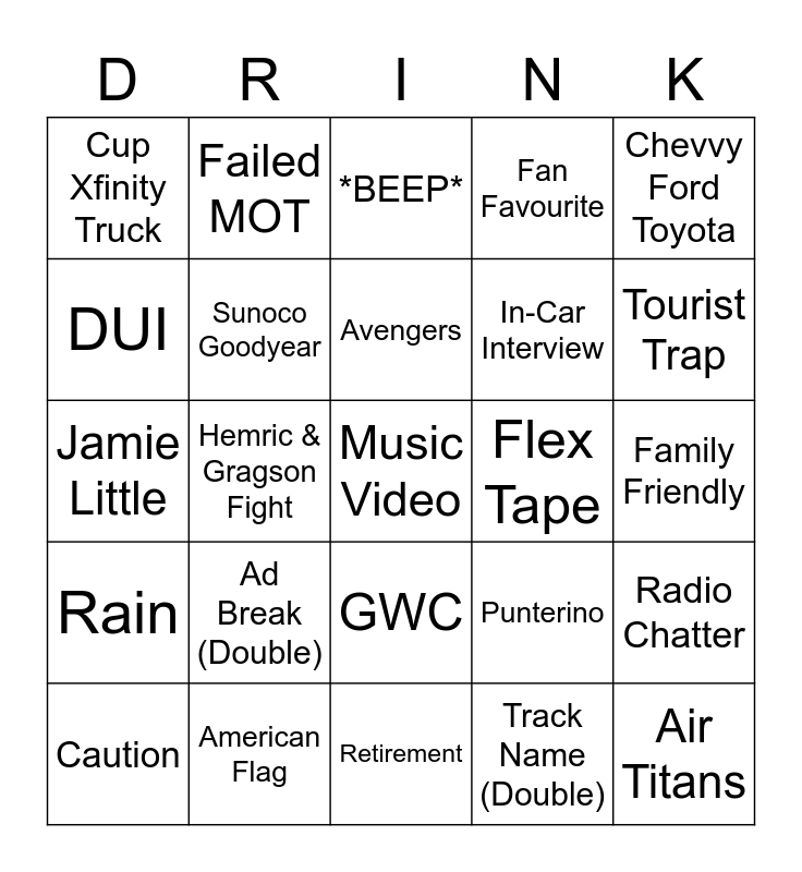 This bingo card has a free space and 24 words: Ad Break (Double), American Flag, Avengers, Caution, Chevvy Ford Toyota, Cup Xfinity Truck, DUI, Failed MOT, Flex Tape, GWC, In-Car Interview, Jamie Little, Punterino, Radio Chatter, Sunoco Goodyear, Track Name (Double), Family Friendly, *BEEP*, Tourist Trap, Hemric & Gragson Fight, Air Titans, Rain, Fan Favourite and Retirement.
