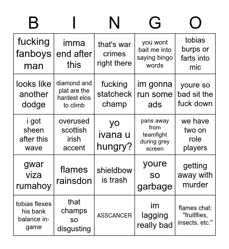 This bingo card has 37 words: this champ/item is so cracked, shut uuuuuuup, plays in diamond, blames teammates for playing like diamond players, diamond and plat are the hardest elos to climb, getting away with murder, flames rainsdon, fucking statcheck champ, tf is so much better than gp, tobias burps or farts into mic, repeats himself with different words, overused scottish irish accent, you wont bait me into saying bingo words, yo ivana u hungry?, we have two on role players, looks like another dodge, gwar viza rumahoy, gapped, that's war crimes right there, shieldbow is trash, pans away from teamfight during grey screen, fucking fanboys man, youre so bad sit the fuck down, tobias flexes his bank balance in-game, ASSCANCER, that's so cringe, im lagging really bad, imma end after this, dreadnova gp was inspired by me, you should duo until masters, ok immanago off mic, sabaton trollfest, that champs so disgusting, i got sheen after this wave, flames chat: ''fruitflies, insects, etc.'', youre so garbage, im gonna run some ads and sylas is so unbalanced.