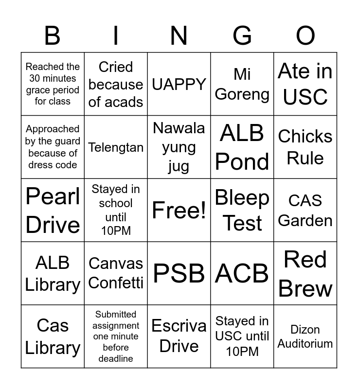 This bingo card has a free space and 24 words: Canvas Confetti, Submitted assignment one minute before deadline, Nawala yung jug, Cas Library, Ate in USC, Reached the 30 minutes grace period for class, Approached by the guard because of dress code, Cried because of acads, Bleep Test, PSB, ALB Pond, Pearl Drive, ACB, Red Brew, Telengtan, Stayed in USC until 10PM, CAS Garden, UAPPY, Chicks Rule, Stayed in school until 10PM, Dizon Auditorium, ALB Library, Mi Goreng and Escriva Drive.