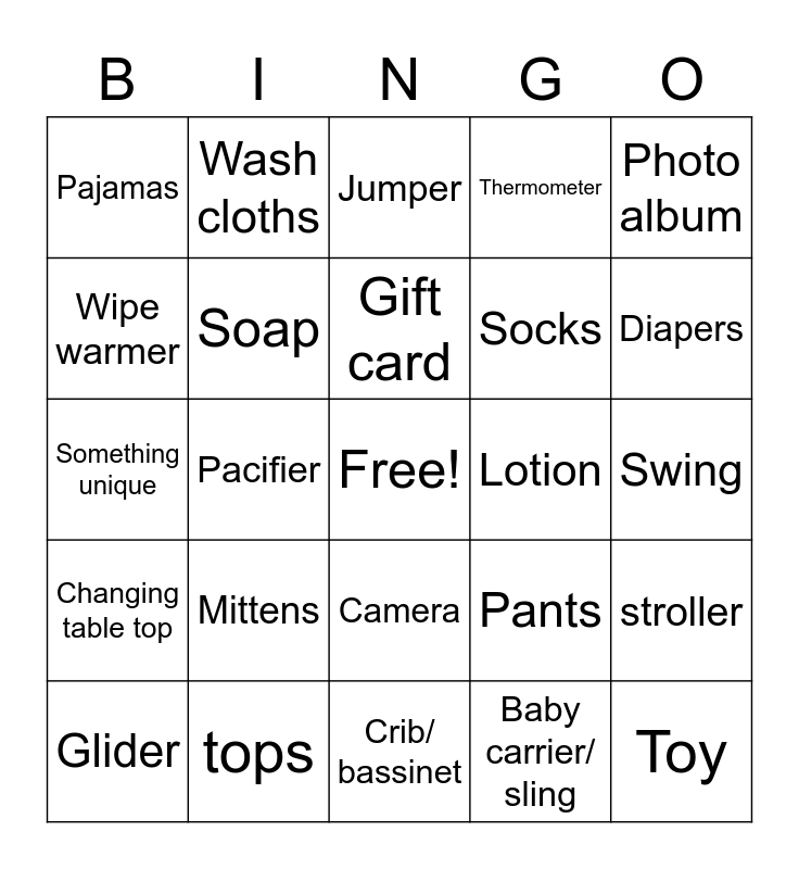 This bingo card has a free space and 50 words: Onesies, Toy, Blanket, Crib/ bassinet, Mittens, Bottle warmer, Wash cloths, Changing pads, Wipe warmer, Burp cloth, Soap, Thermometer, stroller, Pants, Something homemade, Bath tub, Gift card, Lotion, Crib sheets, Photo album, Pacifier, Baby carrier/ sling, Pajamas, Socks, spoons/ cups/ plates, Diaper bag, Diapers, Nursing pillow, Jumper, Camera, Bib, Teether toy, stuffed animal, Towels, tops, Hat, wipes, Swaddles, Baby monitor, Swing, Sleep sack, Grooming kit, On theme - greenery/ floral, Book, Glider, Something unique, car seat, Activity mat, Changing table top and bottle.