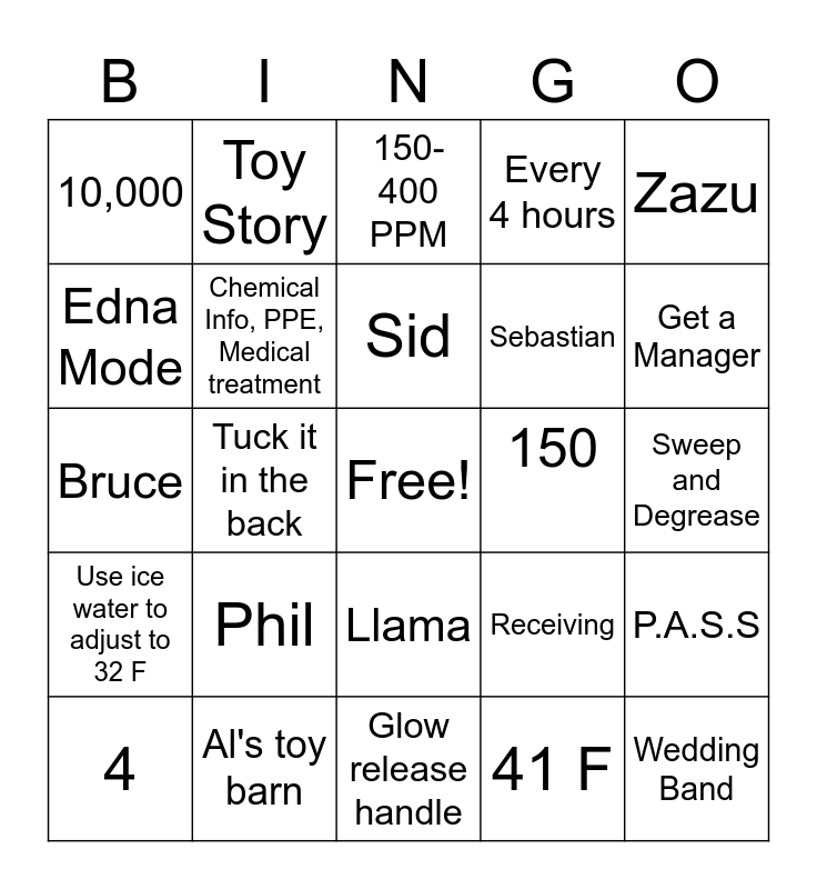 This bingo card has a free space and 24 words: Phil, Al's toy barn, Sid, 4, Zazu, 10,000, Edna Mode, Toy Story, 150, Llama, Sebastian, Bruce, Receiving, P.A.S.S, Chemical Info, PPE, Medical treatment, 41 F, Sweep and Degrease, 150-400 PPM, Get a Manager, Tuck it in the back, Wedding Band, Use ice water to adjust to 32 F, Every 4 hours and Glow release handle.