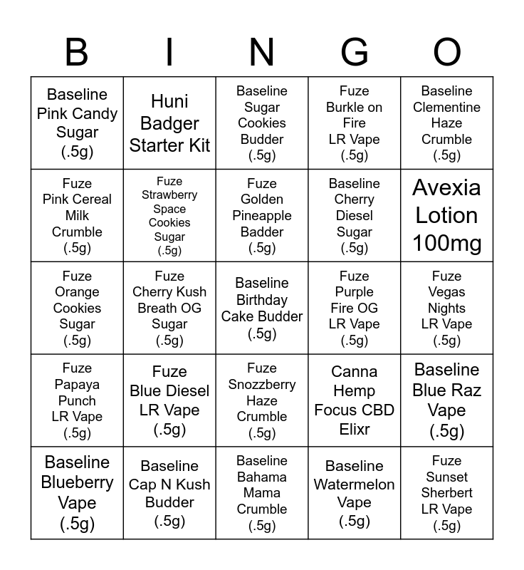 This bingo card has a free space and 24 words: Fuze Blue Diesel LR Vape (.5g), Baseline Cap N Kush Budder (.5g), Fuze Golden Pineapple Badder (.5g), Baseline Blueberry Vape (.5g), Baseline Clementine Haze Crumble (.5g), Baseline Pink Candy Sugar (.5g), Fuze Pink Cereal Milk Crumble (.5g), Huni Badger Starter Kit, Fuze Purple Fire OG LR Vape (.5g), Fuze Snozzberry Haze Crumble (.5g), Baseline Cherry Diesel Sugar (.5g), Fuze Orange Cookies Sugar (.5g), Canna Hemp Focus CBD Elixr, Baseline Blue Raz Vape (.5g), Fuze Strawberry Space Cookies Sugar (.5g), Baseline Watermelon Vape (.5g), Fuze Vegas Nights LR Vape (.5g), Baseline Sugar Cookies Budder (.5g), Avexia Lotion 100mg, Fuze Cherry Kush Breath OG Sugar (.5g), Fuze Sunset Sherbert LR Vape (.5g), Fuze Papaya Punch LR Vape (.5g), Fuze Burkle on Fire LR Vape (.5g) and Baseline Bahama Mama Crumble (.5g).