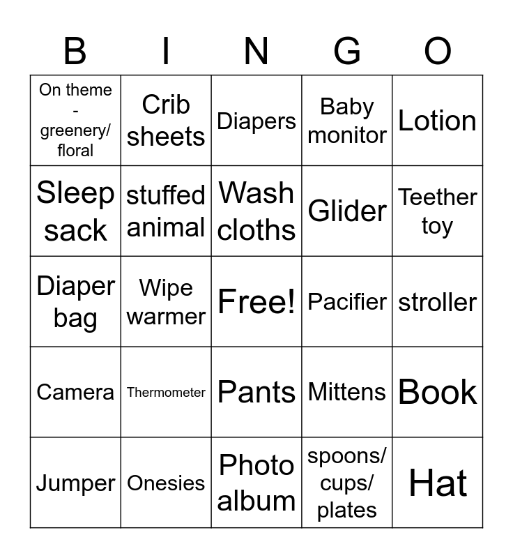 This bingo card has a free space and 50 words: Grooming kit, Hat, Bib, Photo album, Thermometer, Bath tub, Crib sheets, Socks, Sleep sack, bottle, stuffed animal, Baby monitor, Book, Mittens, Nursing pillow, Burp cloth, Wash cloths, Pacifier, Changing table top, Lotion, Wipe warmer, spoons/ cups/ plates, On theme - greenery/ floral, Glider, Something homemade, Swaddles, Teether toy, Something unique, Diapers, Pants, Changing pads, Bottle warmer, wipes, tops, Onesies, Activity mat, Pajamas, Towels, Soap, stroller, Baby carrier/ sling, Gift card, Crib/ bassinet, car seat, Jumper, Diaper bag, Blanket, Swing, Camera and Toy.