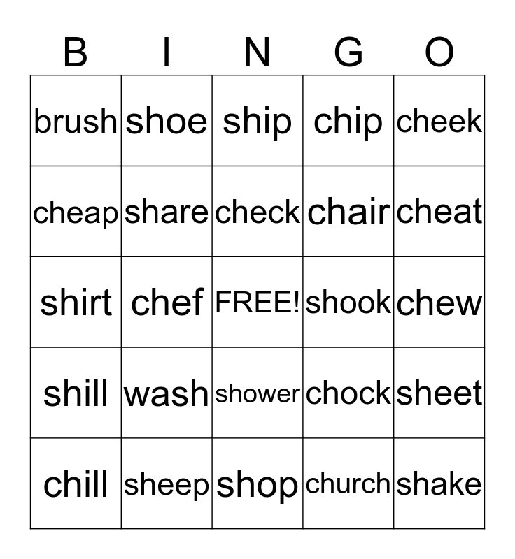 This bingo card has a free space and 24 words: wash, sheep, check, chill, cheek, brush, cheap, shoe, shook, shower, chair, shirt, chock, sheet, share, church, chew, ship, cheat, chef, shake, shill, chip and shop.