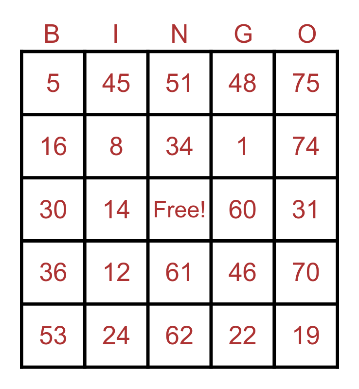 This bingo card has a free space and 24 words: 12, 24, 34, 53, 75, 5, 16, 45, 60, 61, 1, 30, 46, 70, 8, 22, 31, 51, 74, 14, 19, 36, 48 and 62.