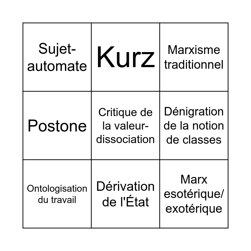 This bingo card has a free space and 8 words: Dénigration de la notion de classes, Marxisme traditionnel, Kurz, Ontologisation du travail, Sujet-automate, Marx esotérique/ exotérique, Postone and Dérivation de l'État.