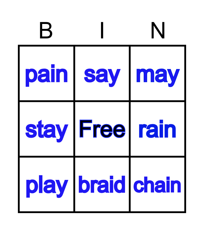 This bingo card has a free space and 8 words: rain, may, say, play, pain, chain, stay and braid.