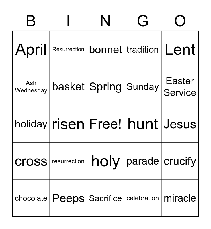 This bingo card has a free space and 31 words: Sacrifice, He lives, risen, God, April, bonnet, basket, parade, hunt, celebration, Jesus, miracle, Palm Sunday, Good Friday, Easter Service, crucifixion, crucify, resurrection, cross, holy, Lent, bouquet, chocolate, Resurrection, Sunday, Ash Wednesday, tradition, holiday, Peeps, Spring and Easter Lily.