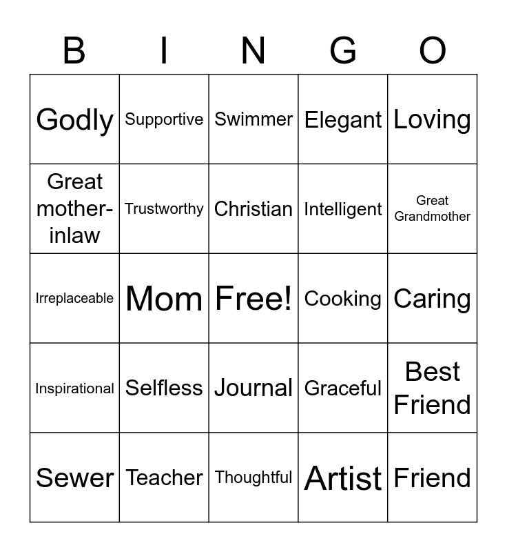 This bingo card has a free space and 30 words: Teacher, Gracious, Mom, Kind, Godly, Swimmer, Trustworthy, Journal, Cooking, Thoughtful, Caring, Friend, Artist, Grandmother, Great Grandmother, Sunshine, Graceful, Inspirational, Selfless, Loving, Irreplaceable, Patient, Supportive, Intelligent, Great mother-inlaw, Elegant, Best Friend, Sewer, Christian and Smart.