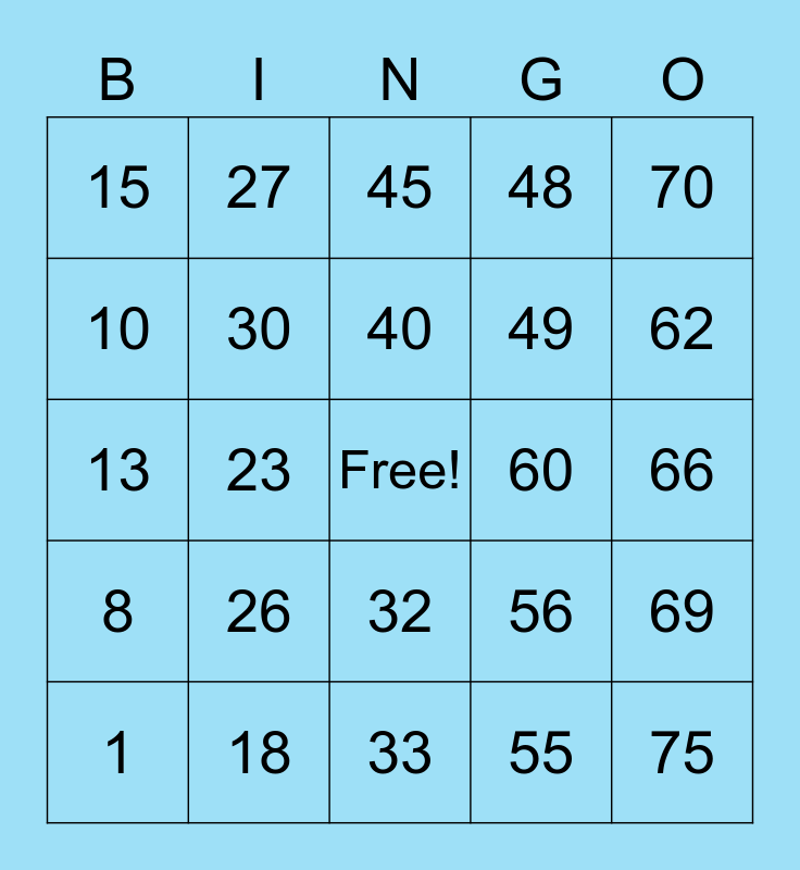 This bingo card has a free space and 24 words: 1, 26, 40, 55, 70, 15, 27, 45, 60, 66, 13, 30, 56, 69, 10, 18, 33, 48, 62, 8, 23, 32, 49 and 75.