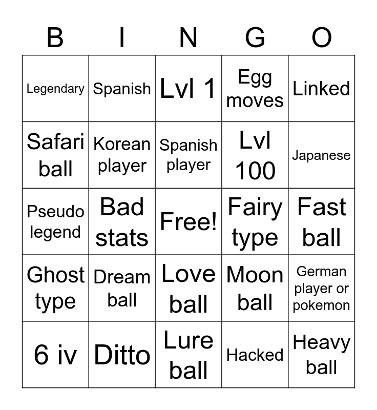 This bingo card has a free space and 24 words: Dream ball, Ditto, Spanish player, 6 iv, Linked, Legendary, Safari ball, Spanish, Fairy type, Love ball, Lvl 100, Pseudo legend, Moon ball, German player or pokemon, Korean player, Hacked, Fast ball, Lvl 1, Japanese, Bad stats, Heavy ball, Ghost type, Egg moves and Lure ball.