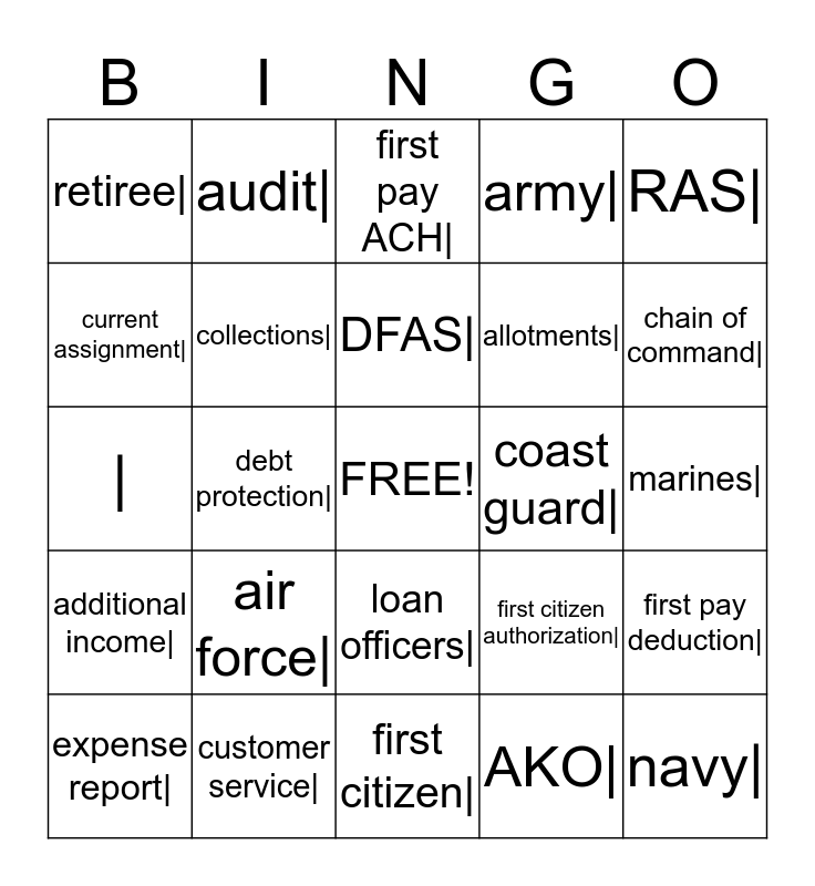 This bingo card has a free space and 41 words: Armed Forces Loans, |, underwriting|, collections|, customer service|, loan officers|, DFAS|, LES|, RAS|, additional income|, debt protection|, army|, navy|, marines|, coast guard|, air force|, DOD|, retiree|, promissory note amendment|, first pay ACH|, first pay deduction|, Mo|, first citizen|, allotments|, credit report|, credit score|, AKO|, net pay EFT|, chain of command|, orders|, funding|, audit|, expense report|, bank statement|, first citizen authorization|, current assignment|, FlexyMax|, personal references|, enterprise email|, Keep In Place| and Notary Public Page|.
