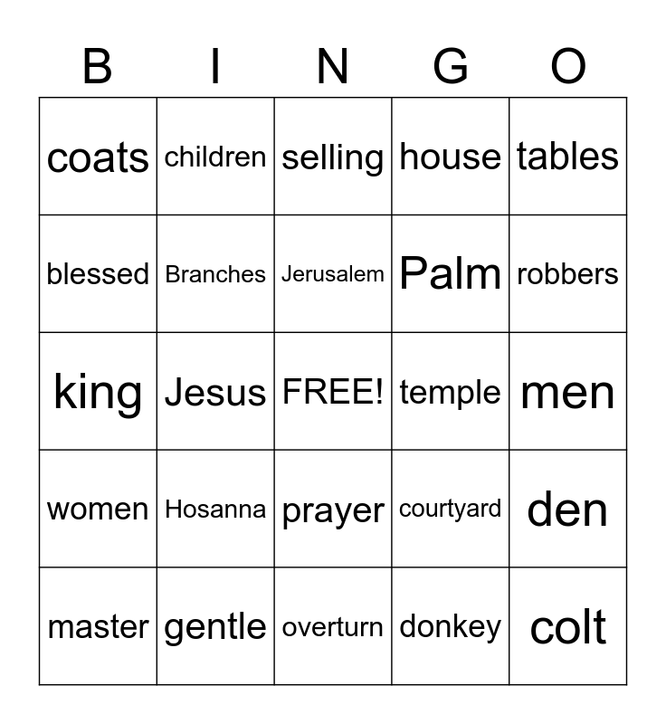 This bingo card has a free space and 24 words: Hosanna, gentle, Jerusalem, master, tables, coats, blessed, children, temple, prayer, Palm, king, courtyard, den, Branches, donkey, men, selling, robbers, Jesus, colt, women, house and overturn.