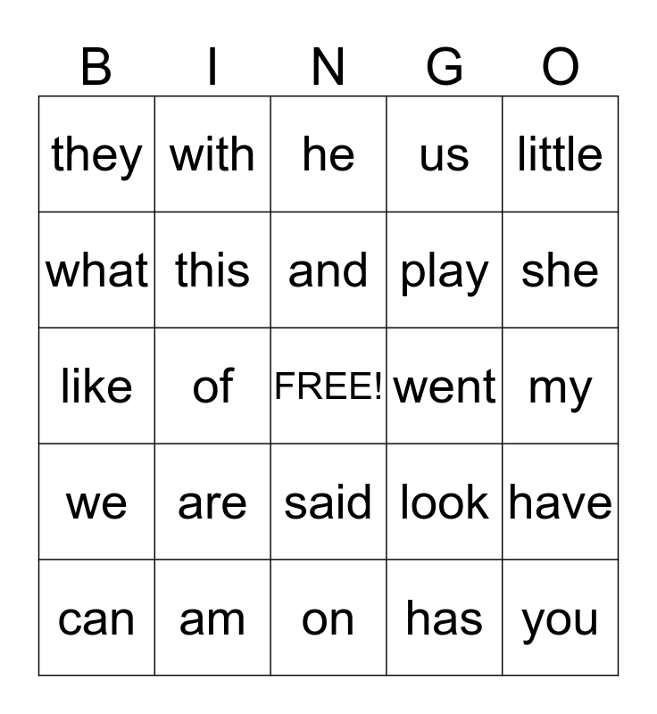 This bingo card has a free space and 24 words: are, am, and, can, little, they, what, with, went, said, play, like, look, have, this, has, my, he, she, of, you, we, us and on.