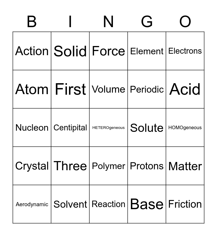 This bingo card has 29 words: Aerodynamic, Drag, Centipital, Friction, Action, Force, First, Three, Solute, Solvent, HOMOgeneous, HETEROgeneous, Reaction, Base, Acid, Plastic, Polymer, Crystal, Electrons, Nucleon, Protons, Compound, Periodic, Atom, Element, Solid, Matter, Volume and Mass.