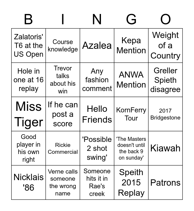 This bingo card has a free space and 24 words: Rickie Commercial, Verne calls someone the wrong name, Any fashion comment, Nicklais '86, Weight of a Country, Zalatoris' T6 at the US Open, Hole in one at 16 replay, Course knowledge, KornFerry Tour, 'Possible 2 shot swing', ANWA Mention, Miss Tiger, 'The Masters doesn't until the back 9 on sunday', Kiawah, Trevor talks about his win, Speith 2015 Replay, 2017 Bridgestone, Azalea, Greller Spieth disagree, If he can post a score, Patrons, Good player in his own right, Kepa Mention and Someone hits it in Rae's creek.