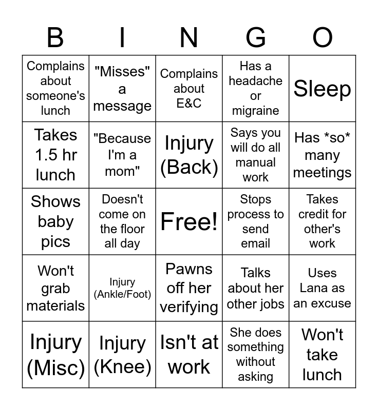 This bingo card has a free space and 24 words: Injury (Ankle/Foot), Injury (Knee), Injury (Back), Injury (Misc), Sleep, Complains about someone's lunch, Takes 1.5 hr lunch, "Misses" a message, Stops process to send email, Pawns off her verifying, Says you will do all manual work, Shows baby pics, Talks about her other jobs, Uses Lana as an excuse, "Because I'm a mom", She does something without asking, Takes credit for other's work, Complains about E&C, Has *so* many meetings, Doesn't come on the floor all day, Won't take lunch, Won't grab materials, Has a headache or migraine and Isn't at work.